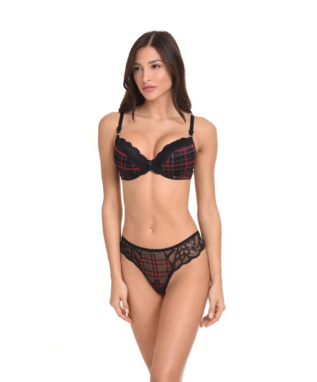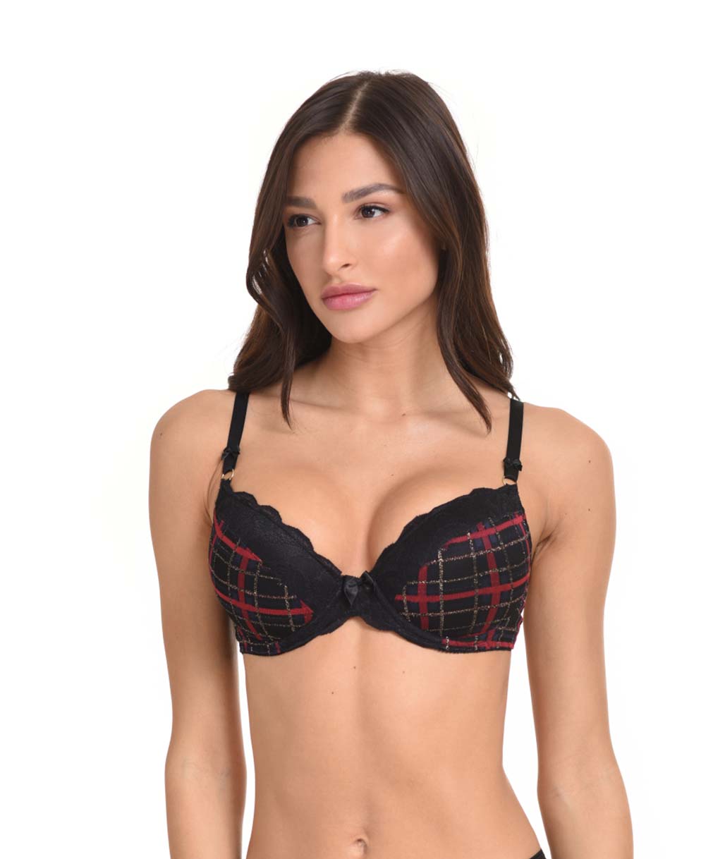 Το push up σουτιέν από τη σειρά Graziella αποτελείται από καρό ύφασμα με χρυσή λεπτομέρεια και μαύρη δαντέλα. Η ενίσχυση χαρίζει επιπλέον μέγεθος στο μπούστο με σταθερό, τέλειο κράτημα. Ο ξεχωριστός του σχεδιασμός το κάνει απλά ακαταμάχητο! Συνδύασέ το με bikini, brazil, string ή τα boxers της σειράς.